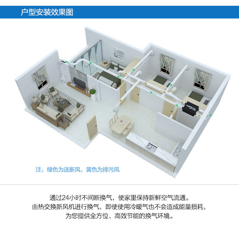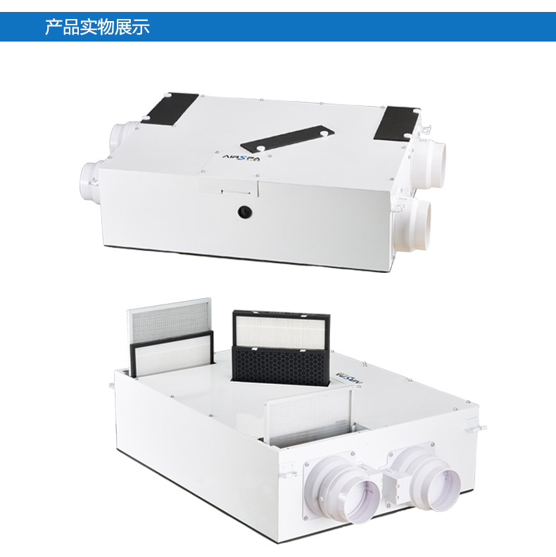 雙向流新風機:訂機采用雙核動力設計,動力強,體積??;采用直流無刷電機,低噪音,低能耗